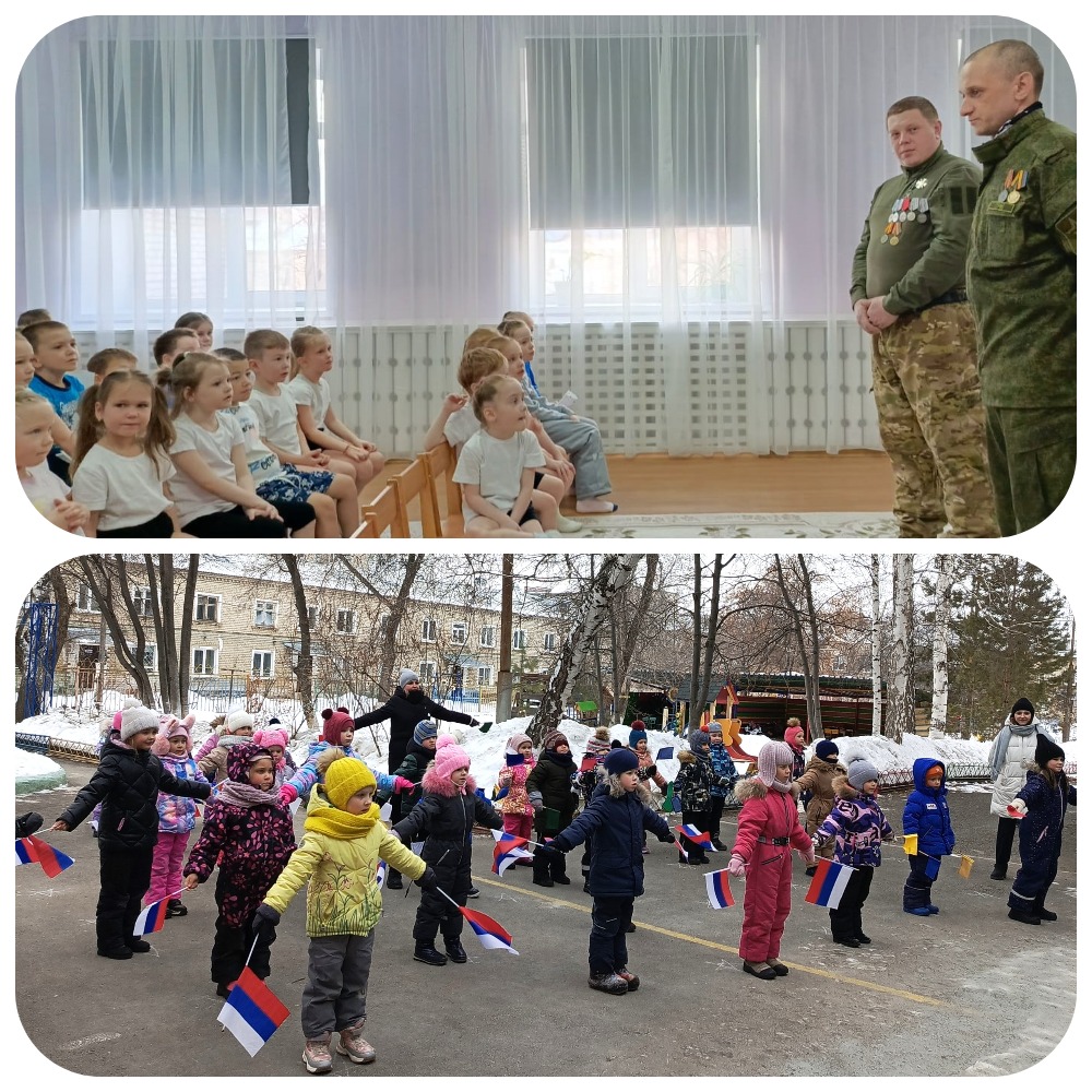 Началась она с презентации военной техники нашей российской армии и беседы с ветеранами боевых действий. Затем мероприятие продолжилось на территории детского сада, начавшись с построения и выноса российского флага.